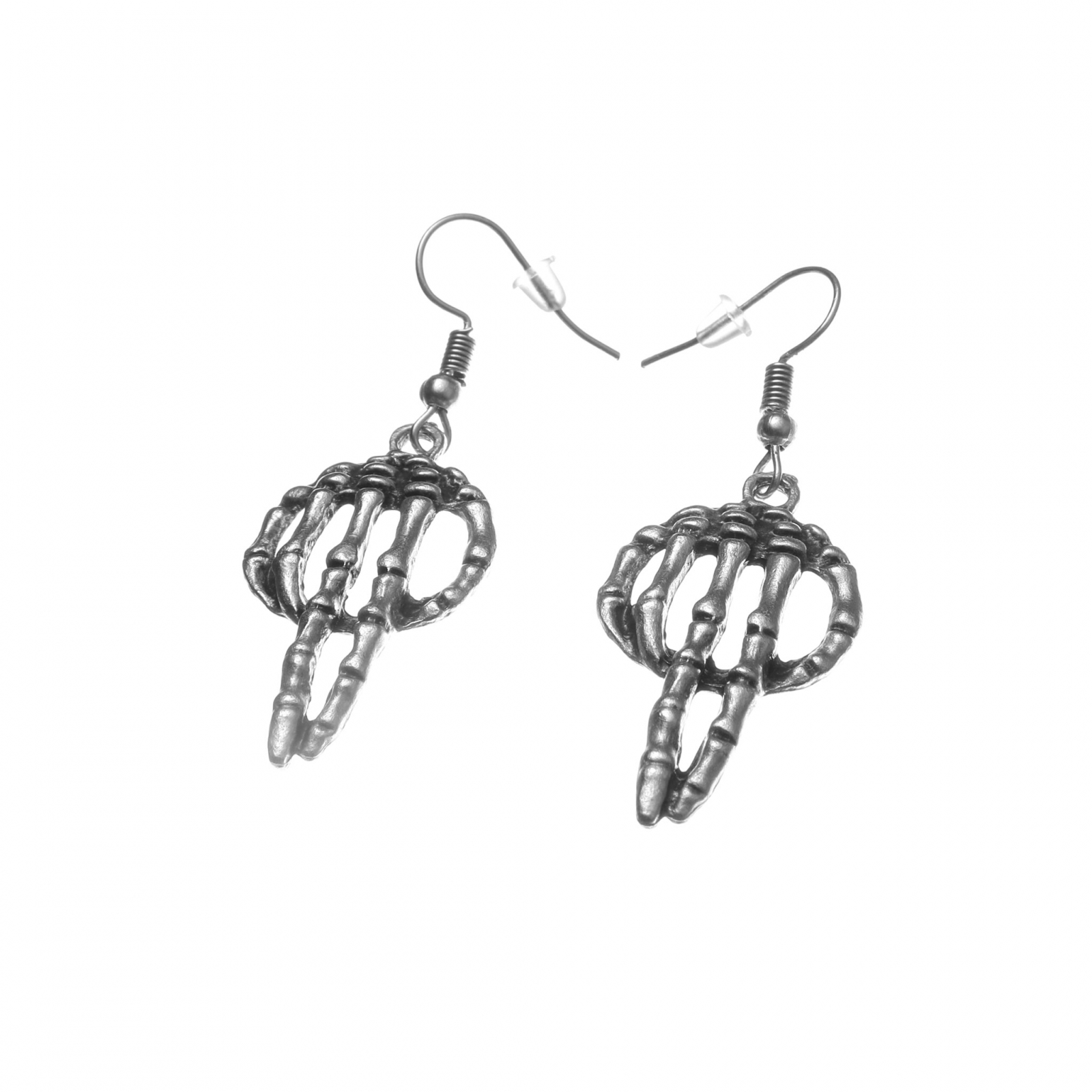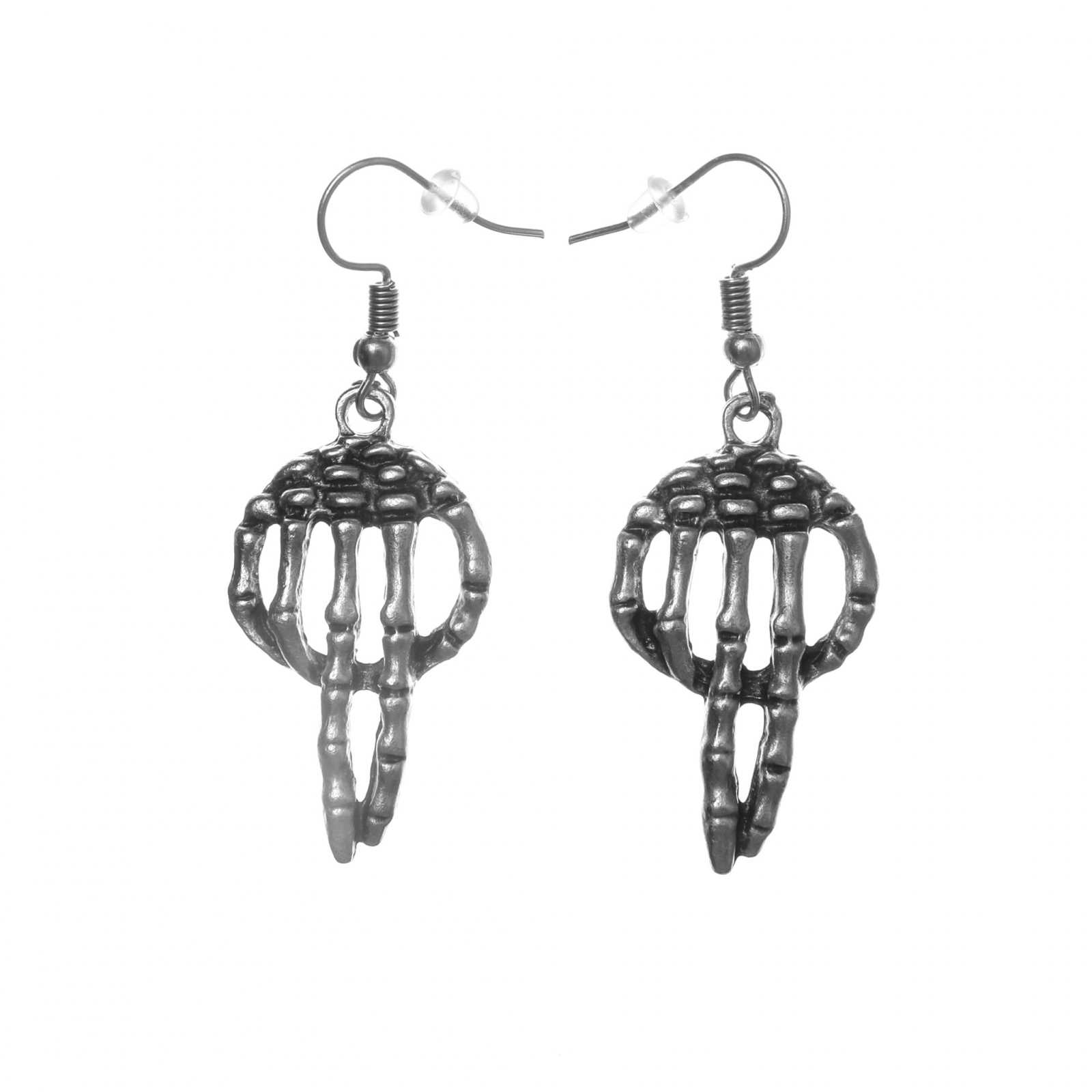 Cerceii din zamac în formă de mână de schelet, cu două degete ridicate, sunt bijuterii îndrăznețe și pline de caracter. Cu un design detaliat și realist, reprezentând contururile unei mâini scheletice cu degetele arătător și mijlociu ridicate, acești cercei adaugă un element de mister și originalitate oricărei ținute.