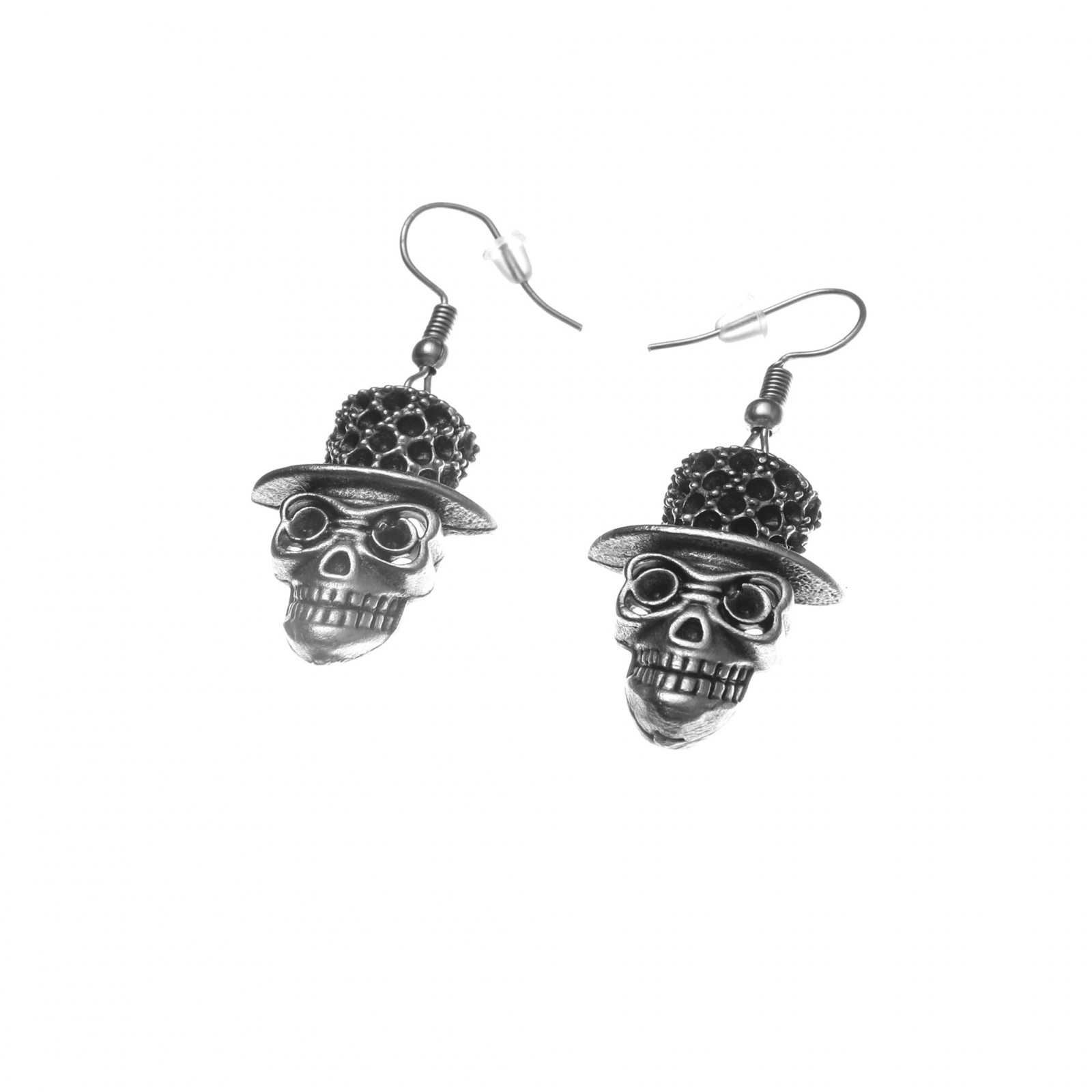 Cerceii din zamac în formă de craniu cu pălărie sunt bijuterii pline de mister și stil. Cu un design distinctiv, reprezentând contururile unui craniu îmbrăcat într-o pălărie elegantă sau retro, acești cercei adaugă un element de originalitate și individualitate oricărei ținute.