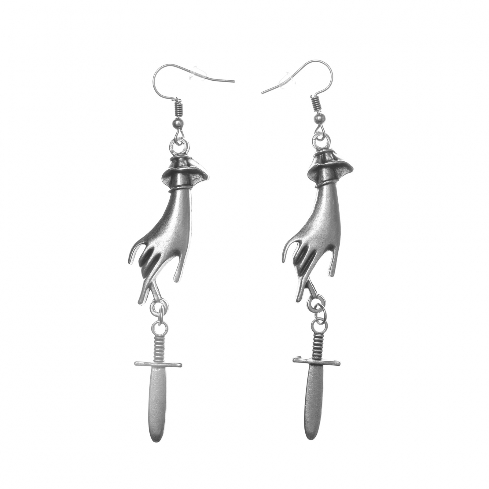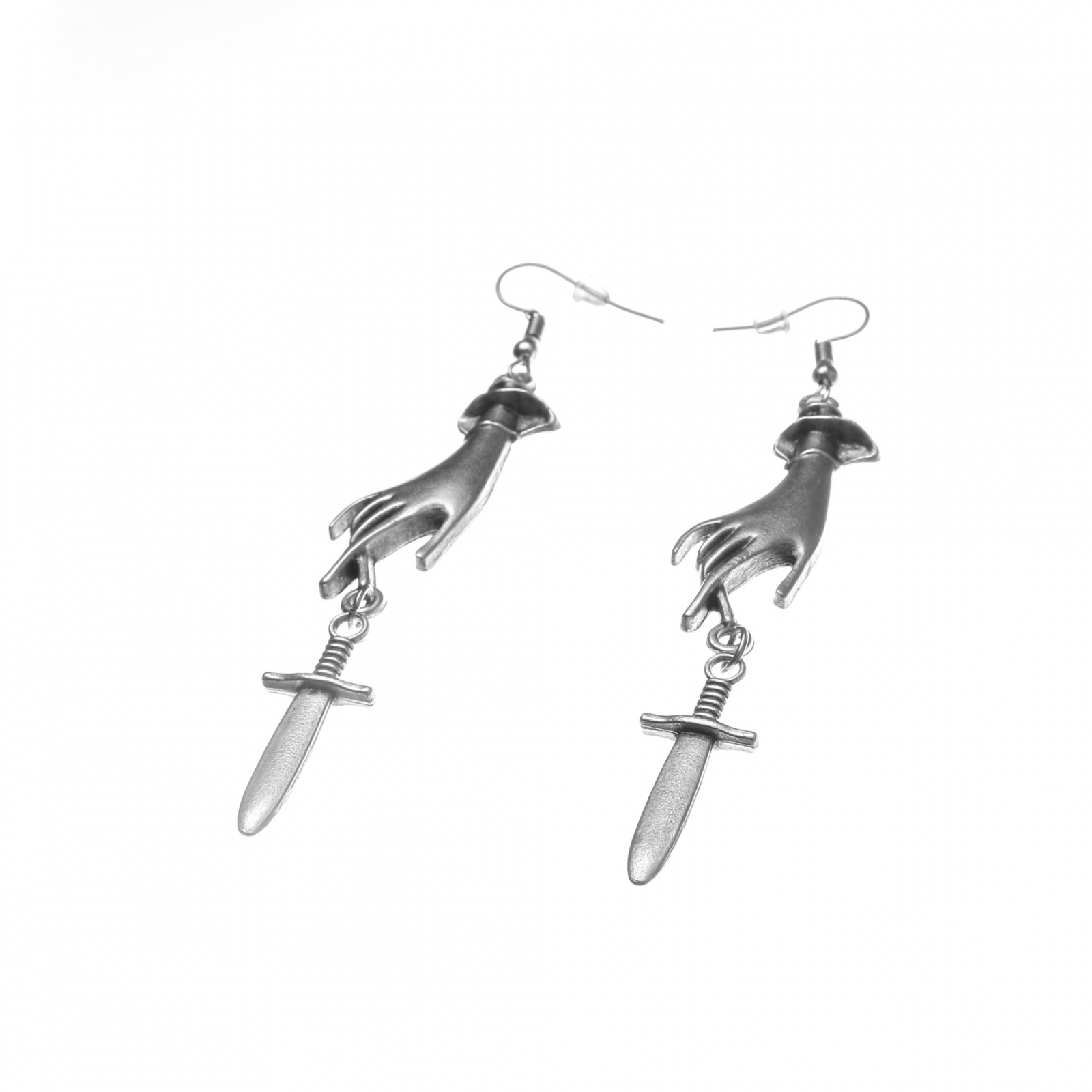 Cerceii din zamac în formă de mână feminină cu un cuțit sunt accesorii cu un aer intrigant și puternic. Cu designul lor distinctiv, reprezentând contururile delicate ale unei mâini feminine care ține un cuțit, acești cercei adaugă o notă de mister și îndrăzneală oricărei ținute.